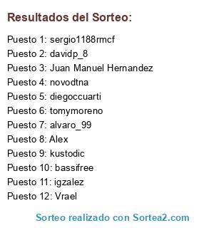 Lista de participantes: kustodic, Alex, Vrael, bassifree, diegoccuarti, igzalez, davidp_8, sergio1188rmcf, Juan Manuel Hernandez, alvaro_99, novodtna, tomymoreno.