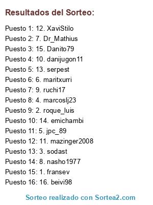 Lista de participantes: 1. fransev , 2. roque_luis , 3. sodast , 4. marcoslj23 , 5. jpc_89 , 6. maritxurri , 7. Dr_Mathius , 8. nasho1977 , 9. ruchi17 , 10. danijugon11 , 11. mazinger2008 , 12. XaviStilo , 13. serpest , 14. emichambi , 15. Danito79, 16. beivi98.