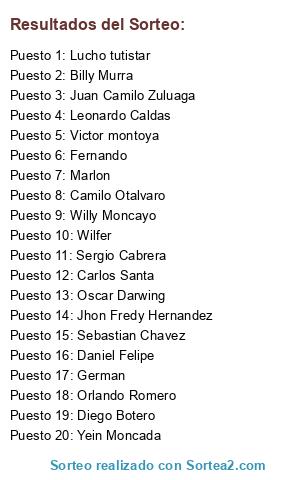 Lista de participantes: Billy Murra, Camilo Otalvaro, Carlos Santa, Daniel Felipe, Diego Botero, Fernando, German, Jhon Fredy Hernandez, Juan Camilo Zuluaga, Leonardo Caldas, Lucho tutistar, Marlon, Orlando Romero, Oscar Darwing, Sebastian Chavez, Sergio Cabrera, Victor montoya, Wilfer, Willy Moncayo, Yein Moncada.