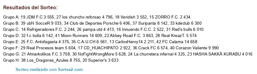 Lista de participantes: 13 CarlosHenry14 2 211, 14 Refrigeradores F.C. 2 244, 15 ZORRO F.C. 2 434, 16 Innuendo F.C.C. 2 522, 17 CD_HUACHIPATO 2 922, 18 Veridish 3 552, 19 JDM F.C 3 555, 20 Superior's 3 633, 21 Ahnarkolikos F.C 3 758, 22 Abbey Road F.C. 3 863, 23 HASHA SAKKĀ KURABU 4 016, 24 La churretera infernal 4 325, 25 F.C. Antofagasta 4 375, 26 pampa utd 4 413, 27 los chuncho reforsao 4 796, 28 Real KreazT. 5 574, 29 Real Procesos team 5 604, 30 NoFightWrongMore 5 628, 31 Red's bulls 6 010, 32 f.c bulla 6 142, 33 kdeclub 6 300, 34 Club de Deportes Porsche 6 406, 35 C.A.U.CH 6 561, 36 Crack FC 6 574, 37 Suripanta 8 142, 38 Los_Dragones_Azules 8 755, 39 ubN SocceR 9 033, 40 Corazon Valiente 9 990, 41 Moon Runners 14 609, 42 FC Calama 14 658.