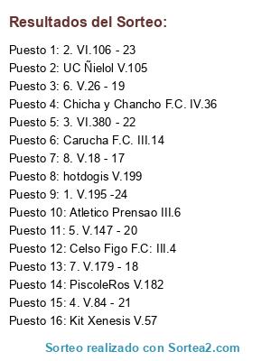 Lista de participantes: 1. V.195 -24, 2. VI.106 - 23, 3. VI.380 - 22, 4. V.84 - 21, 5. V.147 - 20, 6. V.26 - 19, 7. V.179 - 18, 8. V.18 - 17, Celso Figo F.C: III.4, Atletico Prensao III.6, Carucha F.C. III.14, Chicha y Chancho F.C. IV.36, Kit Xenesis V.57, UC Ñielol V.105, PiscoleRos V.182, hotdogis V.199.