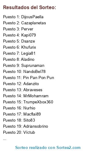Lista de participantes: Perver, NandoBel78, Aladino, Mrtsgi, Víctub, Nurhio, Flywoods, Suprunaman, Kapi079, MrMohamram, Khufurix, Danport, DijousPaella, Pin Pan Pon Pun, Tabascos89, Abraveses, Sito83, Adanzito, Cazaplanetas, Dsanze, TrumpeXbox360, Adriansobrino, Macflai89, Legia81.