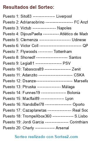 Lista de participantes: Charly --------------- Arsenal, Flywoods ----------- Tottenham, Kapi079 ------------- B.Dortmund, Victub ------------------ Napoles, Mrtsgi ---------------- Milan, Crackeres --------------- Newcastle, Sito83 ----------------- Liverpool, DijousPaella ------------ Atlético de Madrid, Ptruska ------------------ Málaga, NandoBel78 -------------------- Oporto, Tabascos89 -------------------- Zenit, Adanzito -------------------------- CSKA, Adriansobrino --------------------- FC Anzhi Majachkalá, Dsanze---------------------------- Marsella, Clemenza ------------------------ Udinese, Shonedf ------------------------ Santos, Kufhurix ------------------ Ath.Bilbao, TrompeXbox360 ---------------- S.Lisboa, Jordi Garcia ------------------ Corinthians, Funnes19 ------------------- Bolonia, Macflai89 ------------------ Lyon, Legia81 -------------------- PSV, Cazaplanetas ------------------ Real Sociedad, ivfm----------------------------- Swansea, Victor Coll -------------------------------- QPR, overpick ---------------------------------- Sttugart.