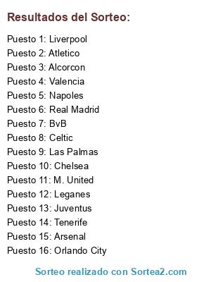 Lista de participantes: M. United, Las Palmas, BvB, Tenerife, Orlando City, Napoles, Alcorcon, Celtic, Chelsea, Atletico, Leganes, Arsenal, Liverpool, Valencia, Juventus, Real Madrid.