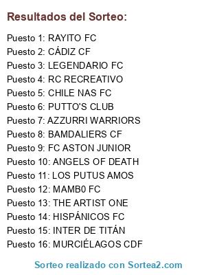 Lista de participantes: LEGENDARIO FC, THE ARTIST ONE, RC RECREATIVO, ANGELS OF DEATH, BAMDALIERS CF, HISPÁNICOS FC, PUTTO'S CLUB, LOS PUTUS AMOS, MURCIÉLAGOS CDF, CÁDIZ CF, CHILE NAS FC, AZZURRI WARRIORS, FC ASTON JUNIOR, INTER DE TITÁN, RAYITO FC, MAMB0 FC.