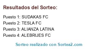 Lista de participantes: TESLA FC, SUDAKAS FC, ALIANZA LATINA, ALEBRIJES FC.