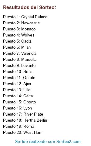 Lista de participantes: Valencia, Celta, River Plate, Hertha Berlin, Lille, Roma, Milan, Betis, Levante, Cadiz, Monaco, Lyon, Marsella, Ajax, Wolves, Crystal Palace, West Ham, Newcastle, Oporto, Getafe.