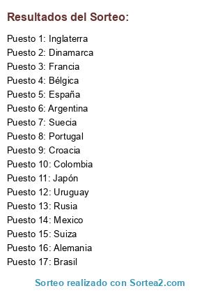 Lista de participantes: Uruguay, Rusia, España, Portugal, Francia, Dinamarca, Croacia, Argentina, Brasil, Suiza, Suecia, Mexico, Bélgica, Inglaterra, Colombia, Japón, Alemania.