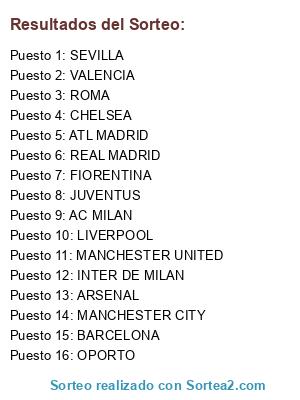 Lista de participantes: REAL MADRID, BARCELONA, INTER DE MILAN, MANCHESTER UNITED, ARSENAL, CHELSEA, MANCHESTER CITY, AC MILAN, VALENCIA, ATL MADRID, LIVERPOOL, JUVENTUS, SEVILLA, ROMA, OPORTO, FIORENTINA.