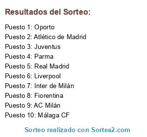 Lista de participantes: Oporto, Fiorentina, Málaga CF, Inter de Milán, Real Madrid, Liverpool, AC Milán, Atlético de Madrid, Parma, Juventus.