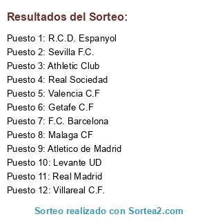 Lista de participantes: Valencia C.F, Villareal C.F., Real Madrid, R.C.D. Espanyol, F.C. Barcelona, Atletico de Madrid, Real Sociedad, Athletic Club, Levante UD, Getafe C.F, Malaga CF, Sevilla F.C..