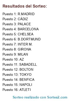 Lista de participantes: BENFICA, R.MADRID, GIRONA, AZ, CHELSEA, NAPOLI, INTER M., TOKYO, BOLTON, BARCELONA, ATLETI, MILAN, PALACE, SABADELL, B.DORTMUND, CÁDIZ.