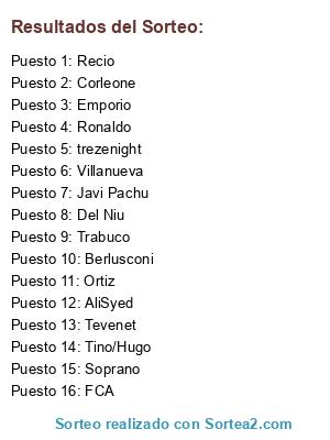 Lista de participantes: Corleone, Berlusconi, trezenight, Del Niu, Tevenet, Emporio, Recio, Soprano, AliSyed, Ronaldo, Villanueva, Trabuco, Tino/Hugo, Ortiz, FCA, Javi Pachu.