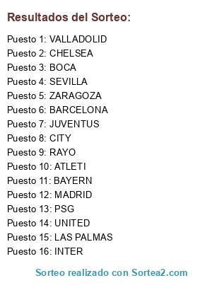 Lista de participantes: CITY, BARCELONA, PSG, MADRID, VALLADOLID, CHELSEA, BAYERN, ATLETI, LAS PALMAS, JUVENTUS, ZARAGOZA, BOCA, UNITED, RAYO, SEVILLA, INTER.