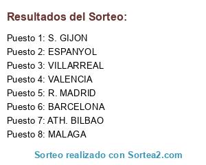 Lista de participantes: MALAGA, S. GIJON, R. MADRID, VILLARREAL, VALENCIA, ESPANYOL, ATH. BILBAO, BARCELONA.