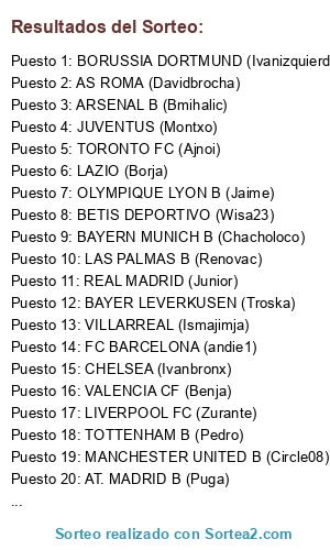 Lista de participantes: CHELSEA (Ivanbronx), MANCHESTER UNITED (Circle08), LIVERPOOL FC (Zurante), TOTTENHAM (Pedro), VALENCIA CF (Benja), MANCHESTER CITY (Pacopaquet), PSG (Alforlan), OLYMPIQUE LYON (Jaime), ARSENAL FC (bmihalic), UD LAS PALMAS (Alexis), BORUSSIA DORTMUND (Ivanizquierdo), BAYERN MUNICH (Chacholoco), BAYER LEVERKUSEN (Troska), ATLÉTICO DE MADRID (Puga14), REAL BETIS (Guisrap), REAL MADRID (Junior), VILLARREAL (Ismajimja), TORONTO FC (Ajnoi), INTER DE MILÁN (Rafavlc), AC MILÁN (Fronko), FC BARCELONA (andie1), LAZIO (Borja), AS ROMA (Davidbrocha), JUVENTUS (Montxo), VALENCIA B (Benja), AT. MADRID B (Puga), LAS PALMAS B (Renovac), MANCHESTER CITY B (Paco), PSG B (Alforlan), BAYERN MUNICH B (Chacholoco), BETIS DEPORTIVO (Wisa23), TOTTENHAM B (Pedro), ARSENAL B (Bmihalic), MANCHESTER UNITED B (Circle08), VILLARREAL B (Isma), OLYMPIQUE LYON B (Jaime).