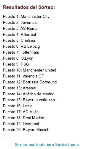 Lista de participantes: Manchester United, Valencia CF, Bayern Munich, Real Betis, Lazio, AS Roma, Bayer Leverkusen, Villarreal, AC Milán, Juventus, O.Lyon, PSG, Liverpool, Chelsea, Arsenal, Real Madrid, Toronto, Tottenham, Borussia Dortmund, Atlético de Madrid, Manchester City, RB Leipzig.