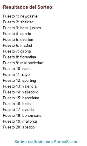Lista de participantes: betis, united, rayo, miami, valencia, fiorentina, leganes, psg, benfica, dormund, osasuna, bodo glimt, bilbao, cadiz, atletico, girona, madrid, st pauli, real sociedad, shaktar, bohemians, valladolid, salzburgo, shalke, shangai port, oviedo, sporting, boca juniors, everton, oporto, barcelona, burgos, chelsea, celta, mallorca, newcastle.
