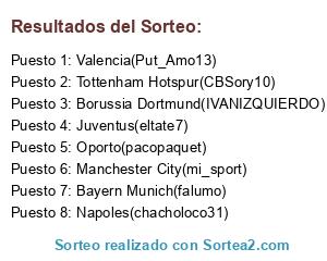Lista de participantes: Juventus(eltate7), Oporto(pacopaquet), Borussia Dortmund(IVANIZQUIERDO), Bayern Munich(falumo), Manchester City(mi_sport), Tottenham Hotspur(CBSory10), Napoles(chacholoco31), Valencia(Put_Amo13).