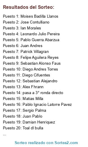 Lista de participantes: Juan Pablo, Ketchup Ignacio Herrera Muñoz, Diego Andres Torres, Jose Elias Sarmiento, Pablo Ignacio Latorre Pavez, Alberto Rodriguez, Diego Cifuentes, Felipe Aguilera Reyes, Leonardo Julio Pereira, Toal dl bulla, Damian Henriquez, Alex Aguirre, Bayron Kun pacheco, Sebastian Alonso Faus, Jose Contulliano, Moises Badilla Llanos, Patrick Villagran, Pablo Guerra Abarzua, Alex Fhrann, Juan Andres, Ian Morales, Luis Arturo Hernandez Ramos, Matias Milla, Sebastian Alejandro, Sergio Palma, pasa a 3° ronda directo.