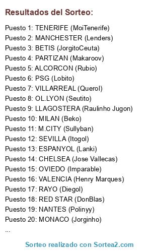 Lista de participantes: SPORTING (Cheche), JUVENTUS (Baricelli), MANCHESTER (Lenders), LLAGOSTERA (Raulinho Jugon), NANTES (Polinyy), MADRID (AdelVal), VALENCIA (Henry Marques), ESPANYOL (Lanki), SEVILLA (Itogol), ARSENAL (Querol), RAYO (Diegol), VILLARREAL (Querol), AT.MADRID (Rafae), PSG (Lobito), MILAN (Beko), M.CITY (Sullyban), RED STAR (DonBlas), OL.LYON (Seutito), CHELSEA (Jose Vallecas), MONACO (Jorginho), OVIEDO (Imparable), PARTIZAN (Makaroov), LEVANTE (Vladi), WOLSFBURGO (El Mercu), ALCORCON (Rubio), BETIS (JorgitoCeuta), TENERIFE (MoiTenerife), BAYERN (Alsua).