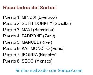Lista de participantes: IBORRA (Napoles), MAXI (Barcelona), SULLEDONKEY (Schalke), PADRONE (Zenit), KALIMONCHO (Roma), MINDIX (Liverpool), SEGO (Monaco), MANUEL (River).