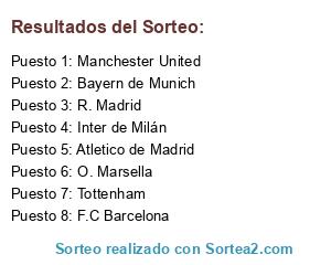 Lista de participantes: O. Marsella, Manchester United, Real Madrid, Inter de Milán, F.C Barcelona, Atletico de Madrid, Bayern de Munich, Tottenham.