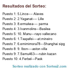 Lista de participantes: 1.Txapafei----at.mineiro, 2.Yaganat---- Lille, 3.Ivanmolins---Basilea, 4.Ferbel---Paok, 5.Lince---- Alaves, 6.emimimora78---Shanghai sipg, 7.Samu463—-rubin kazan, 8.ermakea---- parma, 9. Ibon----aston villa, 10. Manu---rayo vallecano.
