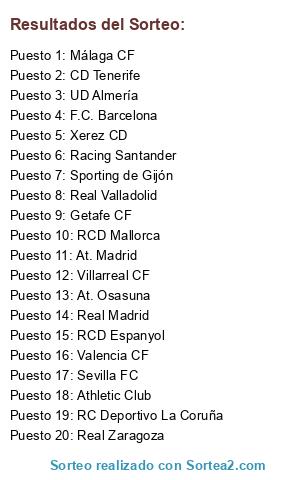 Lista de participantes: REAL MADRID (baricelli), FC BARCELONA (Pedrofox), AT.MADRID (Pepitogrillo96), MALAGA (rastamanlasarte), VALENCIA (hamporc), SEVILLA (SeRgyo2011), VILLARREAL (TurfyTomas), ATH.BILBAO (puerto santiago), BETIS (manolozon), ESPANYOL (pablotp), OSASUNA (thecatonair).