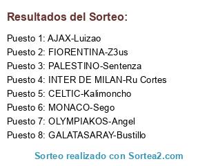 Lista de participantes: PALESTINO-Sentenza, CELTIC-Kalimoncho, AJAX-Luizao, FIORENTINA-Z3us, MONACO-Sego, OLYMPIAKOS-Angel, GALATASARAY-Bustillo, INTER DE MILAN-Ru Cortes.