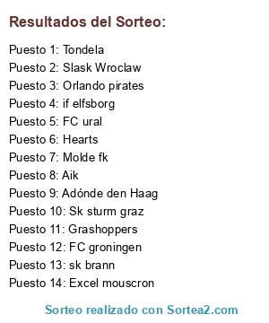 Lista de participantes: Fk Austria, Sk sturm graz, Excel mouscron, Sint-truden, Hearts, Adónde den Haag, FC groningen, Heracles almelo, Molde fk, sk brann, Jagiellonia, Slask Wroclaw, Tondela, Orlando pirates, FC ural, Aik, if elfsborg, FC San galo, Grashoppers.