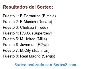 Lista de participantes: B.Munich (Donato), M.United (Milla), Juventus (El2ya), Chelsea (Fredo), Real Madrid (Sergio), M.City (Juanfran), P.S.G. (Superdeivil), B.Dortmund (Elmele).