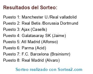 Lista de participantes: Real Madrid (Alvaro), Parma (Acid), Atl Madrid (Alfonso), Manchester U./Real valladolid, Ajax (Casells), Galatasaray SK (Jaime), F.C. Barcelona (Brainismr), Real Betis /Borussia Dortmund.