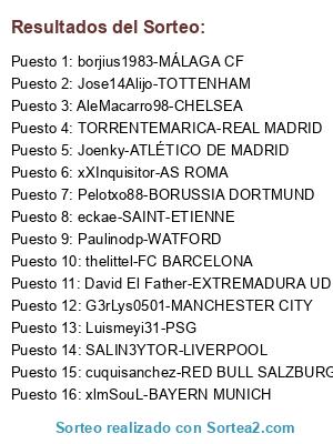 Lista de participantes: eckae-SAINT-ETIENNE, Pelotxo88-BORUSSIA DORTMUND, xXInquisitor-AS ROMA, Jose14Alijo-TOTTENHAM, xlmSouL-BAYERN MUNICH, thelittel-FC BARCELONA, Joenky-ATLÉTICO DE MADRID, SALIN3YTOR-LIVERPOOL, borjius1983-MÁLAGA CF, David El Father-EXTREMADURA UD, cuquisanchez-RED BULL SALZBURGO, Paulinodp-WATFORD, AleMacarro98-CHELSEA, TORRENTEMARICA-REAL MADRID, G3rLys0501-MANCHESTER CITY, Luismeyi31-PSG.