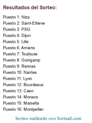 Lista de participantes: Caen, Toulouse, Lille, Montpellier, Rennes, Nantes, Bourdeaux, Lyon, Marsella, Niza, Monaco, Dijon, Saint-Ettiene, PSG, Amiens, Guingamp.