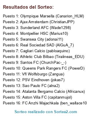 Lista de participantes: Sunderland AFC (Wade1298), Olympique Marsella (Canarion_HLM), Cagliari Calcio (pabloaquino), Real Sociedad SAD (AlGuA_7), PSV Eindhoven (jokas7), Sao Paulo FC (alna2), Vfl Wolfsburgo (Zangua), Swansea City (adonai11), Montpellier HSC (Marius10), Ajax Amsterdam (ChristianJPP), Atalanta Bergamo Calcio (Africanux), Athletic Club Bilbao (Tiralineas_EDU), Queens Park Rangers FC (PowerD), Santos FC (ChurchPac-_-), FC Anzhi Majachkala (ben_wallace10), Aston Villa FC (capitanmujol).