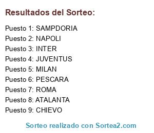 Lista de participantes: NAPOLI, ATALANTA, ROMA, PESCARA, SAMPDORIA, CHIEVO, INTER, MILAN, JUVENTUS.