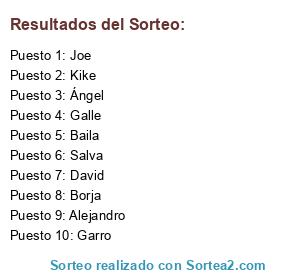 Lista de participantes: Joe, Baila, Borja, David, Salva, Garro, Ángel, Kike, Galle, Alejandro.
