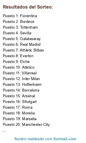 Lista de participantes: Milan, Tottenham, Lyon, Roma, Athletic Bilbao, Elche, Aston Villa, Sevilla, Juventus, Bayern Munich, Galatasaray, Morelia, Manchester City, Arsenal, Barcelona, Liverpool, Chelsea, Atletico, Manchester United, Valencia, Real Madrid, Inter Milan, Hoffenheim, Marsella, Burdeos, Werder Bremen, Fiorentina, Villarreal, Sttutgart, Everton, Ganador Everton vs Porto, Ganador Wolfsburgo vs Hamburgo.