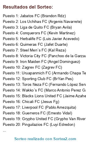 Lista de participantes: Valkrew FC (Haziel Valken Heisenberg), Toros Neza FC (Fernando López Servín), Los Uchihas FC (Argenis Navarrete), Gambetas FC (Icaros GS), Uruapanmich FC (Armando Chapa Tejeda), Steel Men´s FC (Kal Reza), Victoria City FC (Panchoo de la Garzaa), Jabatos FC (Brandon Rdz), Pinguilazios FC (Luyi Edredon), Chelsea FC (David Cedeño), Zagrev FC (Zagrev FC), Wakko´s FC (Marco Antonio Perez Garces), Liverpool FC (Pablo Amezquita), Liga de Quito FC (Bryan Avila), Grypho United FC (Grypho Van River), Guerreros FC (Ernesto Vidal), Chicali FC (Jesus Fg), Sporting Club FC (BrYan Pes), Rebaño Sagrado FC (Hugo Dominguez), Quimeras FC (Jafet Duarte), Herbalife FC (Luis Javier Acevedo), Blacks Lions United FC (Jaime Azahel Juarez Rdz), Iron Maiden FC (Angel Dominguez), Conquerors FC (Kevin Martinez).
