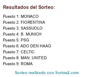 Lista de participantes: B. MUNICH, PSG, MONACO, ADO DEN HAAG, CELTIC, MAN. UNITED, FIORENTINA, SASSUOLO, ROMA.