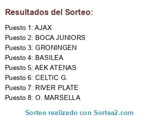 Lista de participantes: AJAX, GRONINGEN, BOCA JUNIORS, CELTIC G., BASILEA, AEK ATENAS, O. MARSELLA, RIVER PLATE.