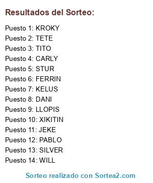 Lista de participantes: KELUS, JEKE, SILVER, TITO, STUR, WILL, TETE, PABLO, CARLY, LLOPIS, XIKITIN, DANI, KROKY, FERRIN.