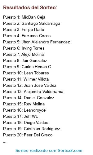 Lista de participantes: Daniel Gonzalez, Cristhian Rodriguez, Facundo Cocco, Alex Gates, Irving Torres, Imanoll Torres, Felipe Darío, Jeff WE, Lean Tobares, Carlos Henao G, Feer Del Greco, Alejo Molina, Whiteny Gómez, Juan Andrés, Juan Jose Valdez, David Sebastian Hoyos, Jhon Alejandro Fernandez, MicDan Ceja, Santiago Saldarriaga, Nikolas Carlsson, German de Bonis, Luis Alejandro, Wilmer Villota, Diego Valdes, Rey Molina, Victor Ramirez, Alejandro Valderrama, Jair Gonzalez, Joaquin Gonzalez, Isamael Cruz, Ariel Checho, Leandroydei.