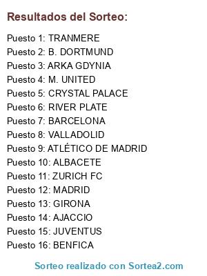 Lista de participantes: VALLADOLID, ALBACETE, BARCELONA, JUVENTUS, MADRID, CRYSTAL PALACE, M. UNITED, B. DORTMUND, ZURICH FC, GIRONA, RIVER PLATE, BENFICA, ATLÉTICO DE MADRID, ARKA GDYNIA, TRANMERE, AJACCIO.