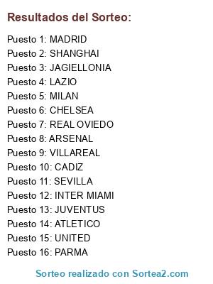 Lista de participantes: REAL OVIEDO, SEVILLA, MILAN, LAZIO, JAGIELLONIA, INTER MIAMI, CHELSEA, PARMA, ATLETICO, VILLAREAL, UNITED, ARSENAL, CADIZ, MADRID, JUVENTUS, SHANGHAI.