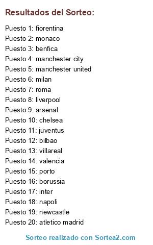 Lista de participantes: roma, arsenal, atletico madrid, chelsea, milan, liverpool, monaco, juventus, valencia, benfica, manchester united, manchester city, villareal, inter, napoli, porto, newcastle, bilbao, borussia, fiorentina.