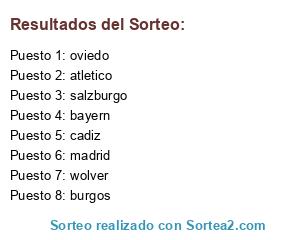 Lista de participantes: salzburgo, madrid, atletico, wolver, bayern, burgos, oviedo, cadiz.