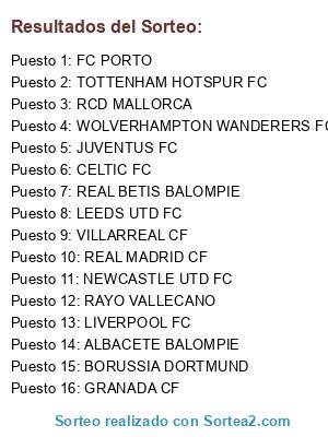 Lista de participantes: ALBACETE BALOMPIE, REAL BETIS BALOMPIE, BORUSSIA DORTMUND, CELTIC FC, GRANADA CF, JUVENTUS FC, LEEDS UTD FC, LIVERPOOL FC, RCD MALLORCA, NEWCASTLE UTD FC, FC PORTO, RAYO VALLECANO, REAL MADRID CF, TOTTENHAM HOTSPUR FC, VILLARREAL CF, WOLVERHAMPTON WANDERERS FC.