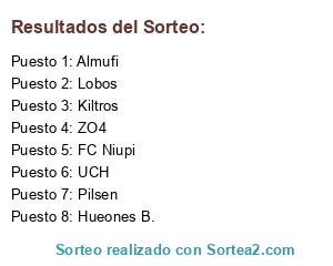 Lista de participantes: Lobos, Hueones B., UCH, ZO4, Pilsen, Almufi, Kiltros, FC Niupi.